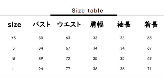 XS:着丈65cm 肩幅33cm バスト80cm 袖丈33cm ウエスト63cm