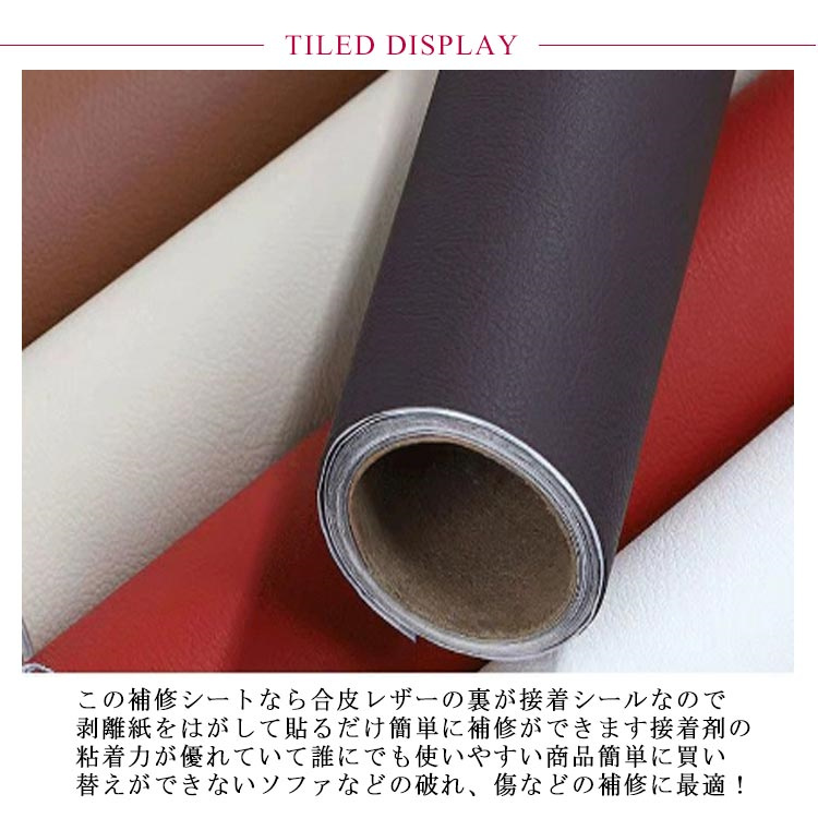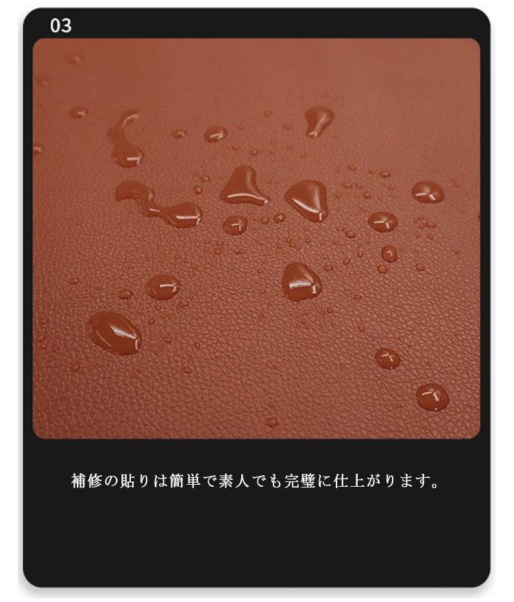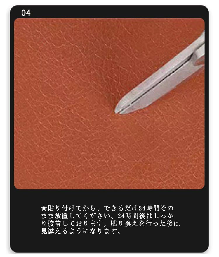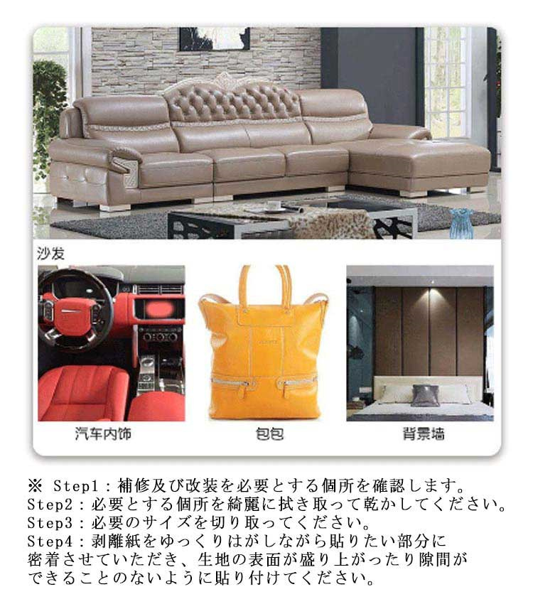 補修シールとして使い方について:※ 補修の貼りは簡単で素人でも完璧に仕上がります。Step1:補修及び改装を必要とする個所を確認します。Step2:必要とする個所を綺麗に拭き取って乾かしてください。Step3:必要のサイズを切り取ってください。Step4:剥離紙をゆっくりはがしながら貼りたい部分に密着させていただき、生地の表面が盛り上がったり隙間ができることのないように貼り付けてください。★貼り付けてから、できるだけ24時間そのまま放置してください、24時間後はしっかり接着しております。貼り換えを行った後は見違えるようになります。