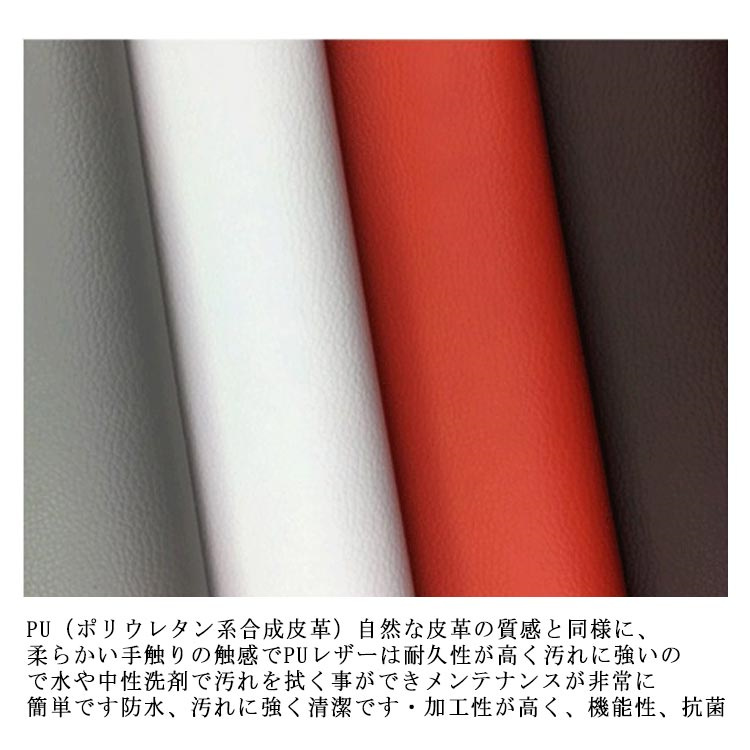 【素材】PU(ポリウレタン系合成皮革)自然な皮革の質感と同様に、柔らかい手触りの触感でPUレザーは耐久性が高く汚れに強いので水や中性洗剤で汚れを拭く事ができメンテナンスが非常に簡単です防水、汚れに強く清潔です・加工性が高く、機能性、抗菌
