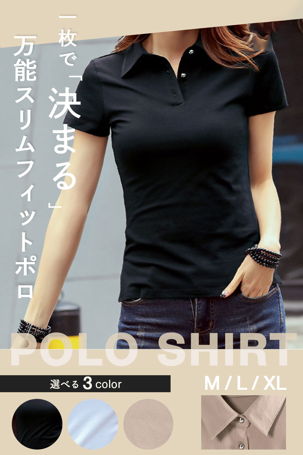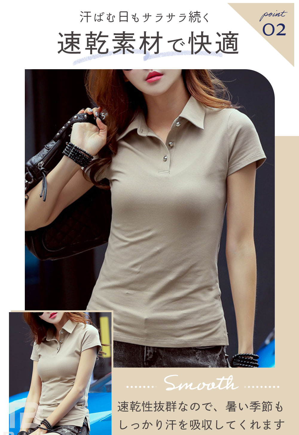 レディース スタイリッシュ 半袖 おしゃれ 夏 スリム ストレッチ ポロシャツ カジュアル コーデ 快適 着心地 通勤 速乾 衿 カジュアルシャツ メタリック風 ボタン シンプル ボタン付き 無地 白 黒