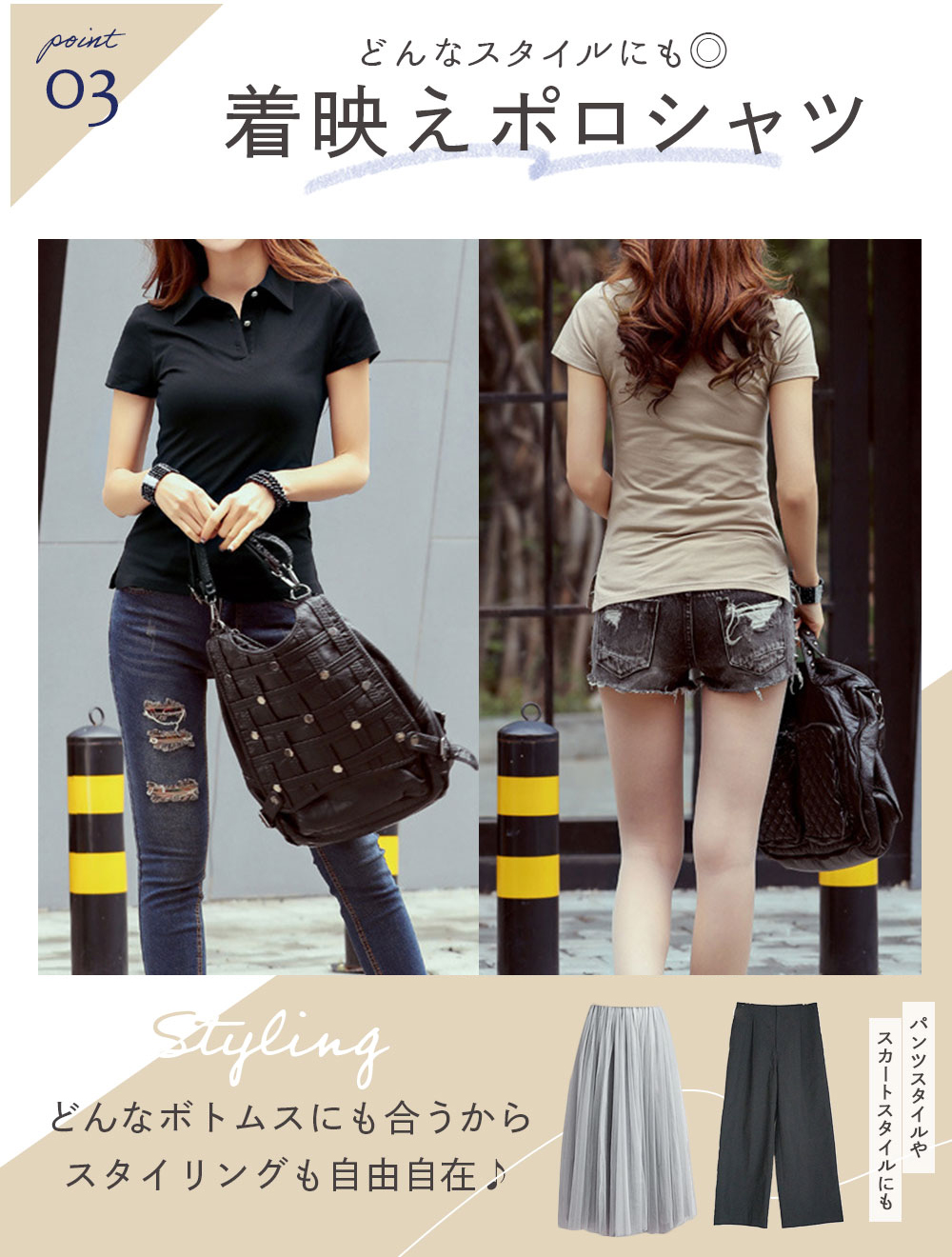 ・シンプルなデザインで落ち着いた色味なので年齢を選ばず、様々なコーディネートが楽しめます。カジュアルにショートパンツ、デニム、スキニーパンツ、スリムフィットジーンズ、カーゴパンツ、ワイドパンツなどのボトムスやフォーマルにスラックス、スカートとも相性抜群です。