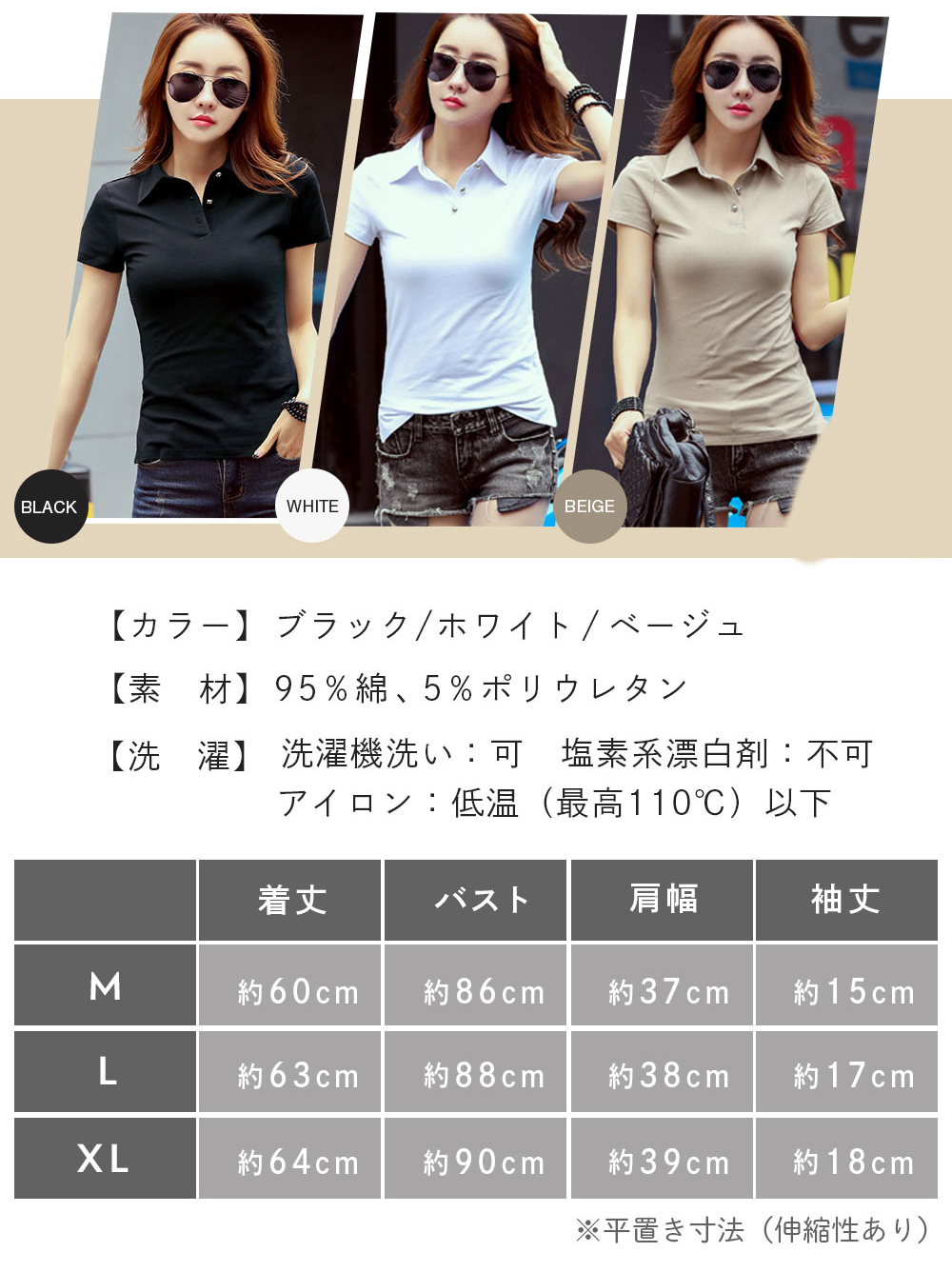 「XL」:着丈 約64cm、バスト 約90cm、肩幅 約39cm、袖丈 約18cm
