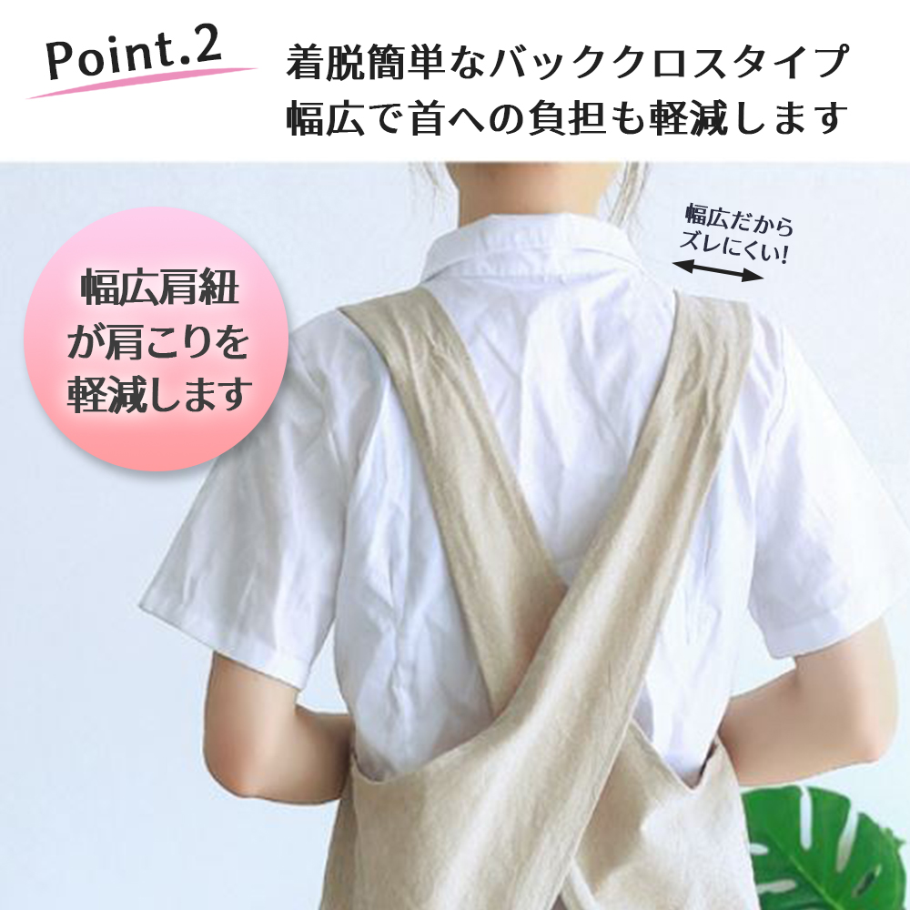 【首への負担が少ないクロスエプロン】細い紐のエプロンは首への負担が大きく、肩こりの原因になります。