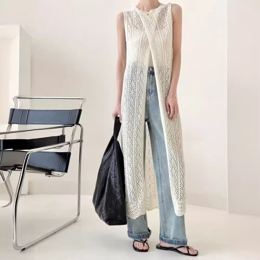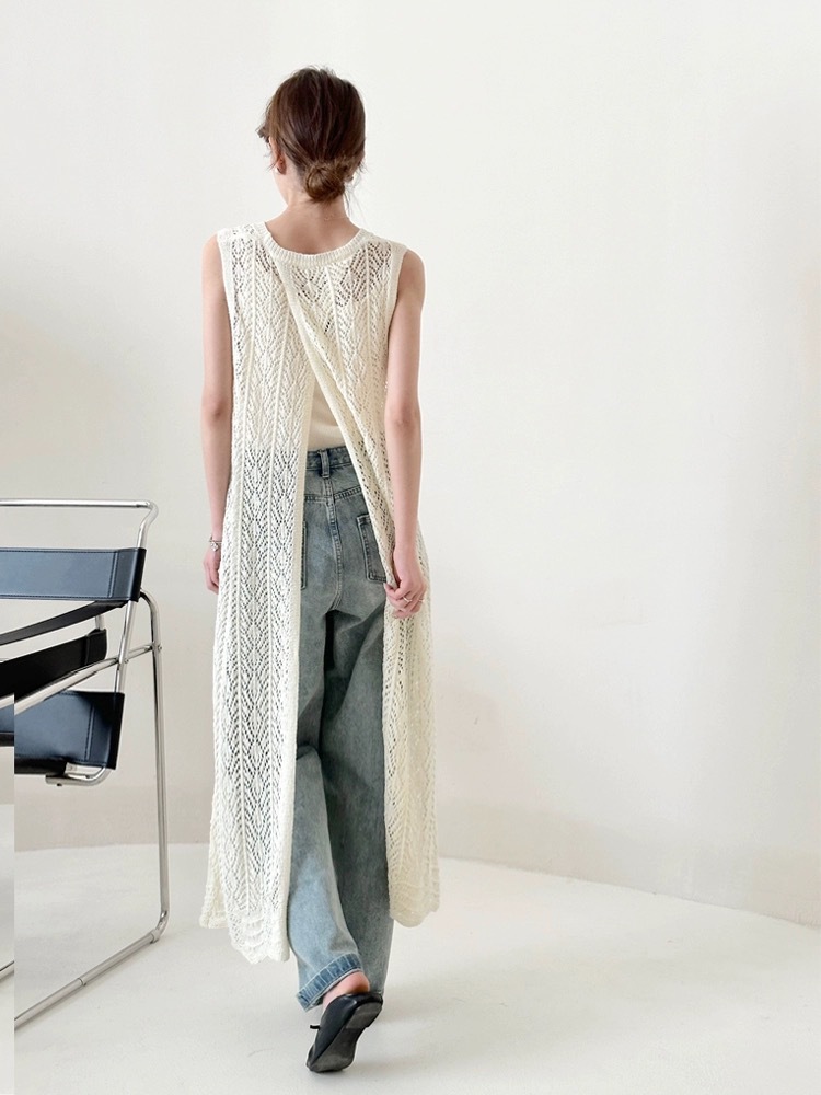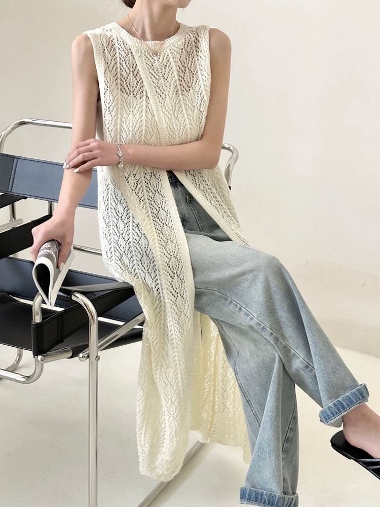 ワンピース レディース ノースリーブ メッシュニット メッシュ 透かし編み レイヤード サマーニット ロング丈 体型カバー 白