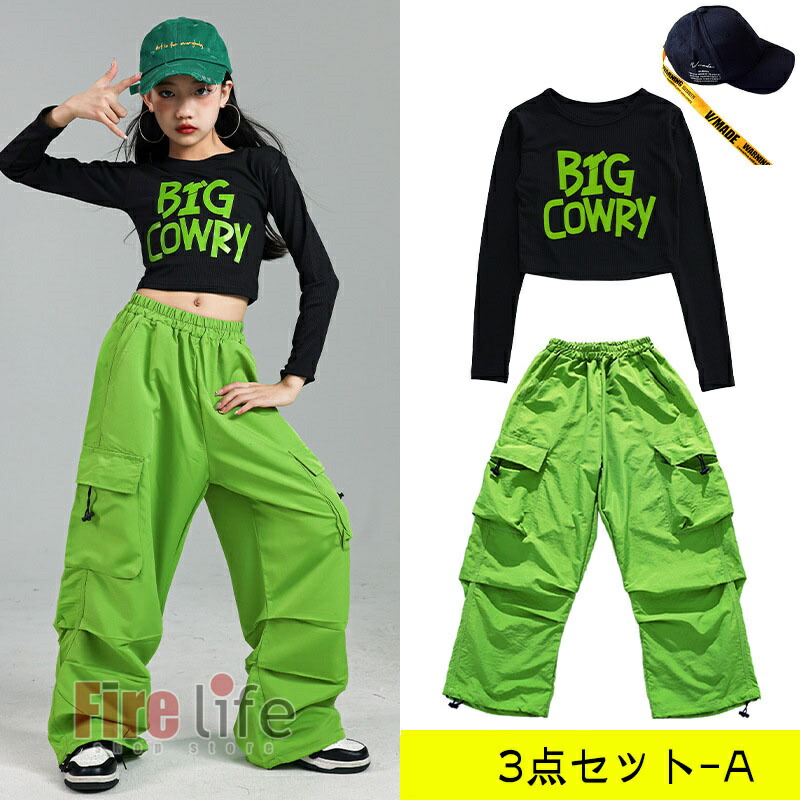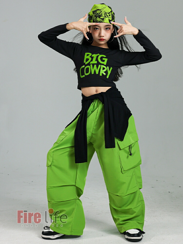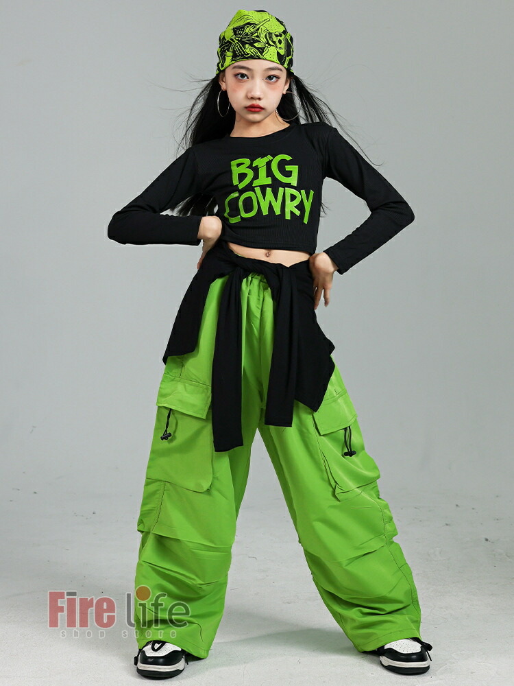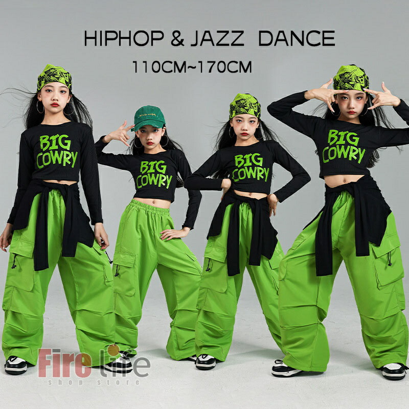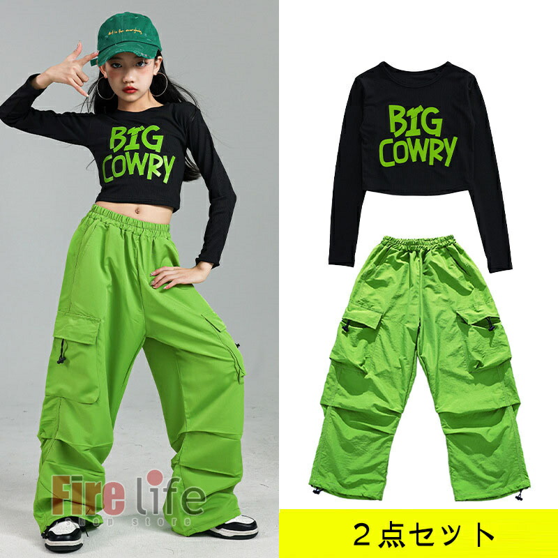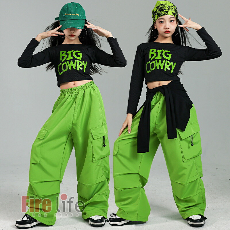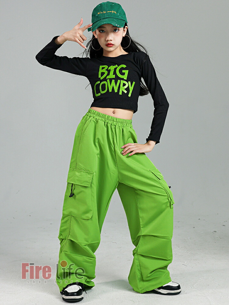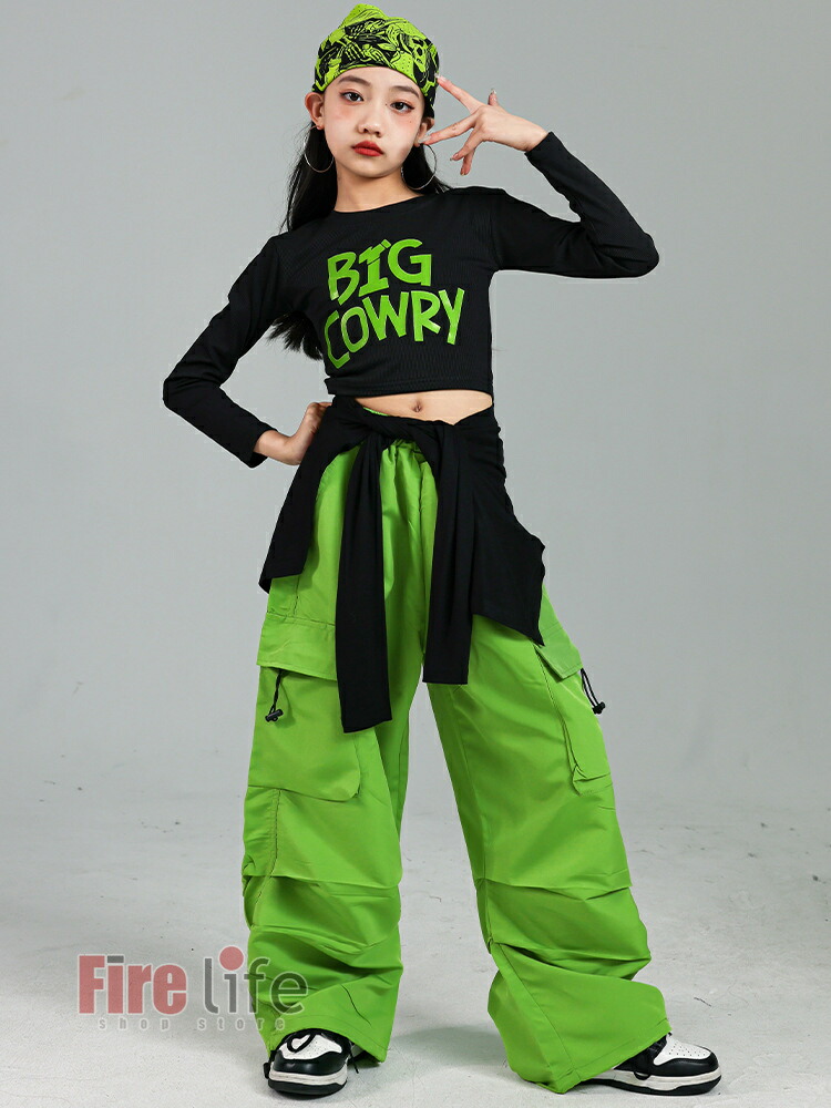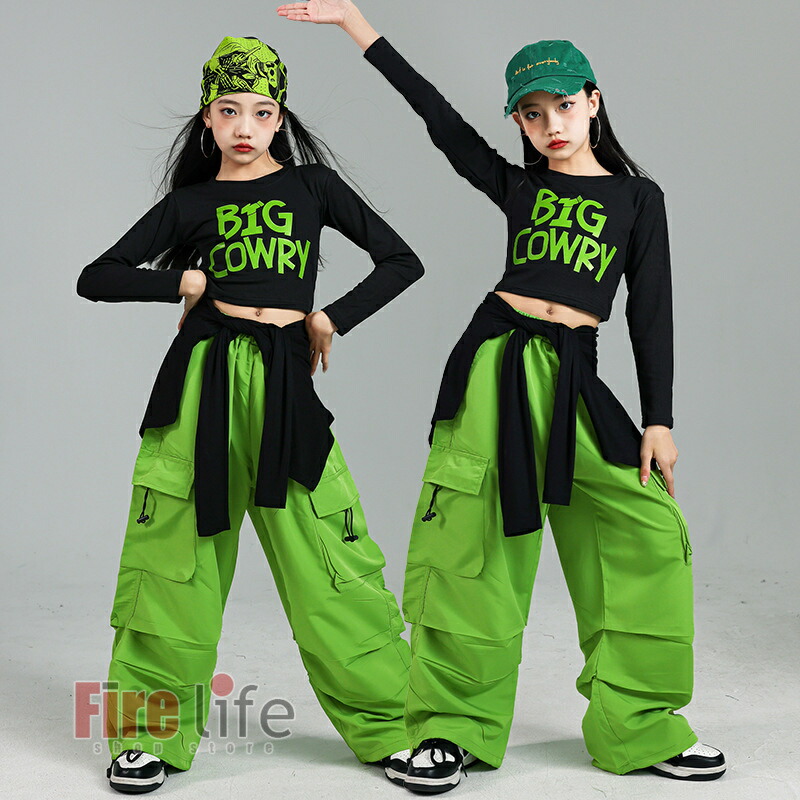 キッズダンス衣装 チアガール韓国ダンス へそ出しトップス 黒 長袖 グリーン ロングパンツ ヒップホップ セットアップ hiphop K-pop衣装 おしゃれ ジャズ 子供服 おしゃれ アイドル 団体服 演出服 ステージ 派手 応援団 発表会 110-170cm