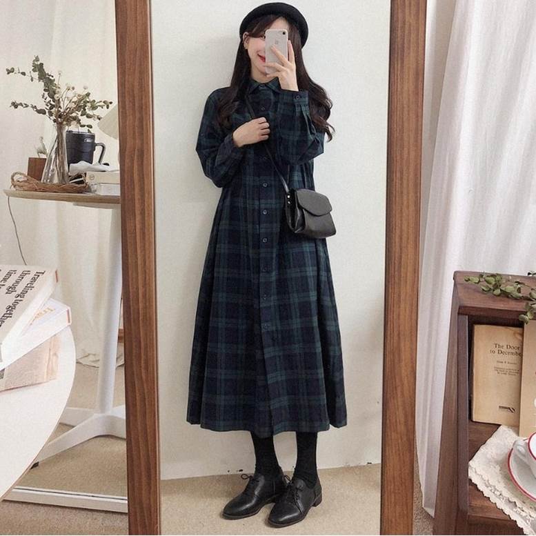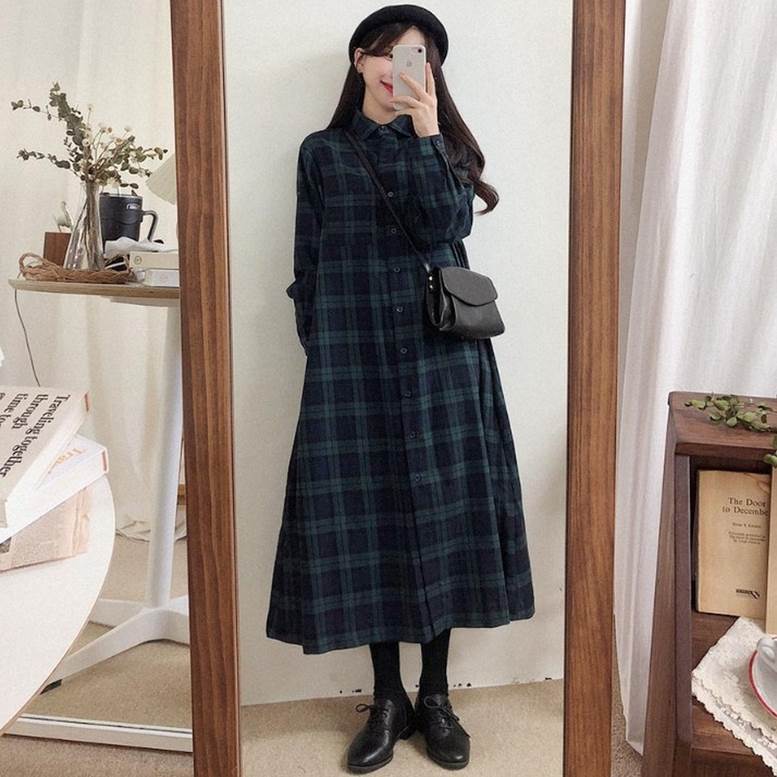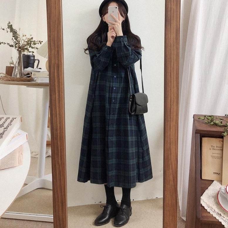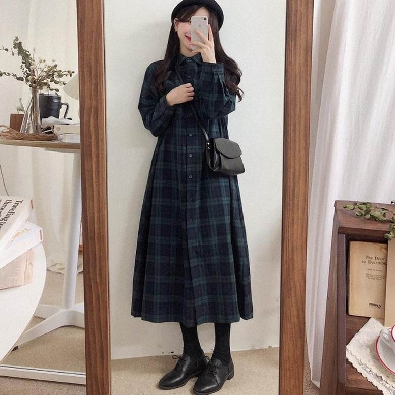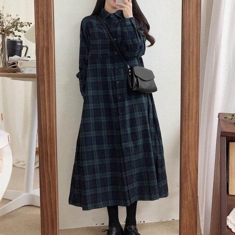 ワンピース シャツワンピ レディース チェック柄 襟付き ボタン 長袖 春 秋 冬 ロング丈 ミモレ丈 個性的 前開き プリント シャツ ドレス 緑 大人可愛い きれいめ 上品 レトロ