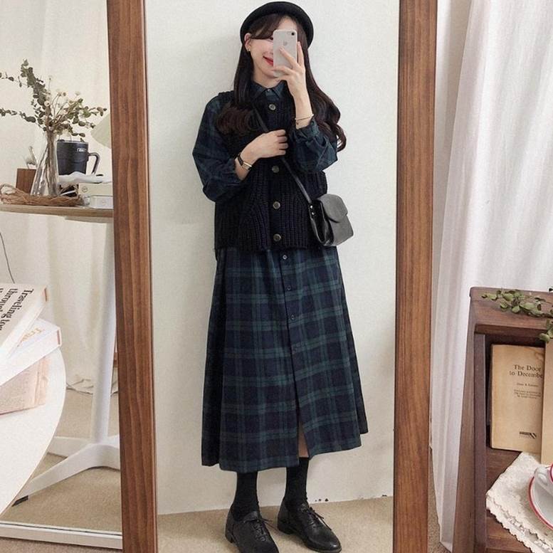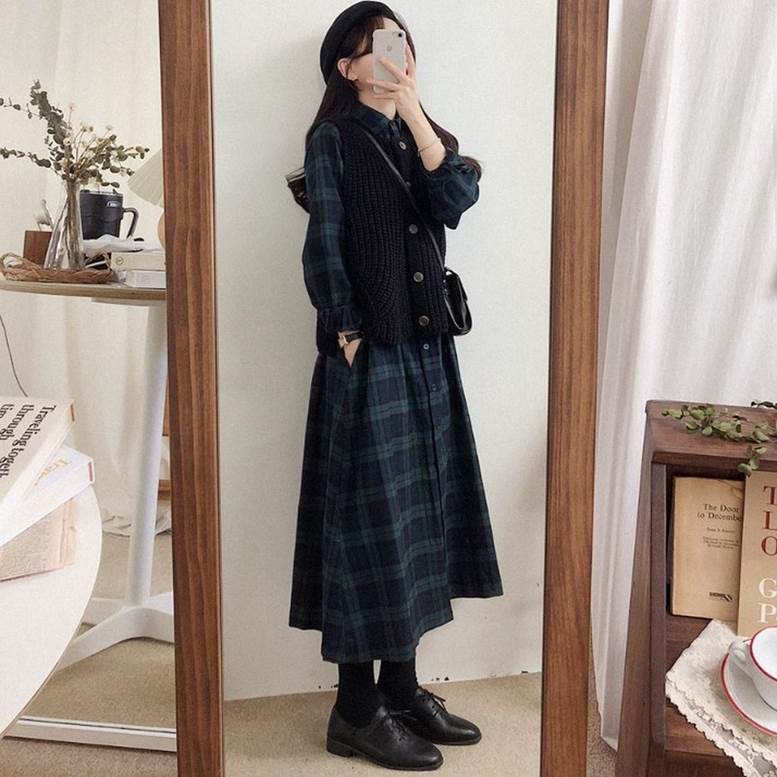 落ち感のある色合いのチェック柄がクラシカルなワンピース
