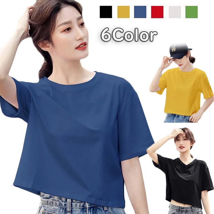 Tシャツ ショートTシャツ カットソー トップス レディース 半袖 ショート丈 おしゃれ ゆったり 体型カバー 短め 無地 大人可愛い 綿 コットン シンプル カジュアル 夏 春 秋 大きいサイズ Vネック ランドネック 通勤 通学 送料無料 S M L XL 2XL